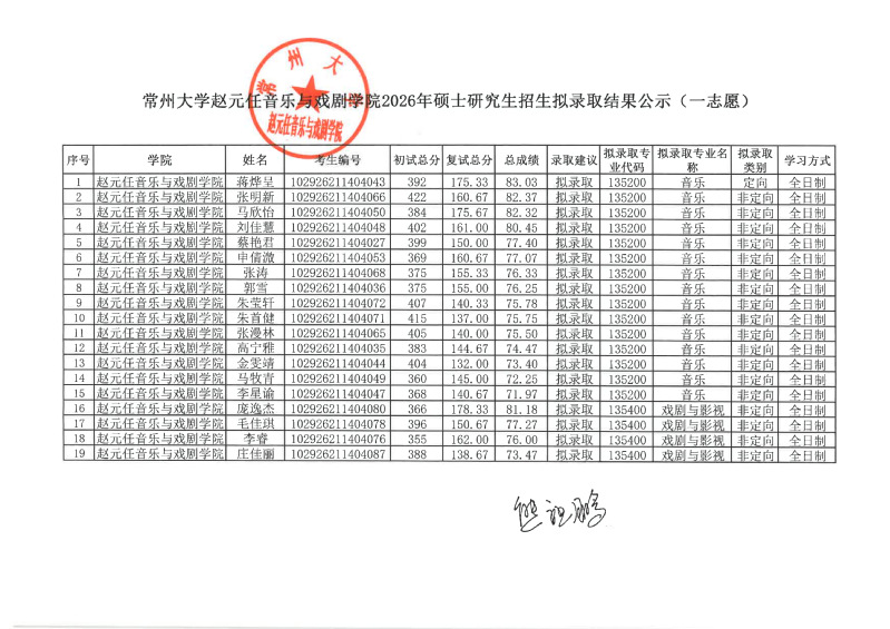 赵元任音乐与戏剧人前露出2026年硕士研究生招生拟录取结果公示(一志愿)