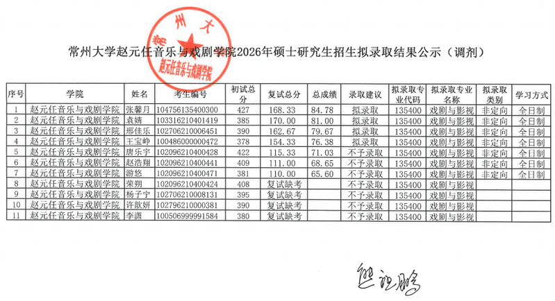 赵元任音乐与戏剧人前露出2026年硕士研究生招生拟录取结果公示(调剂)